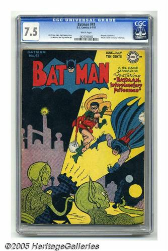 <B>Batman #41 (DC, 1947) CGC VF- 7.5 White pages.</B></I> This issue has this title's first science fiction cover and story. There's also a story featuring that Bumbershoot Bandit himself, the Penguin. The cover and interior art are by Jim Mooney. Overstreet 2005 VF 8.0 value = $519. CGC census 3/05: 2 in 7.5, 15 higher. <I>From the Northern Lights Collection.</B></I>