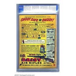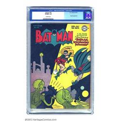 Batman #41 (DC, 1947) CGC VF/NM 9.0 Off-white pages. This is the first Batman cover and story with a science fiction theme. This copy has a perfect spine and like-new color and gloss. Only light corner wear keeps it from the highest grades. Overstreet 2002 VF 8.0 value = $494; NM 9.4 value = $875. Important notice: We expect to be auctioning lots at the rate of 200-250 per hour. Sometimes eBay Premier live bid software cannot keep up with that pace, so we strongly recommend that you place a realistic proxy bid now as insurance to avoid disappointment. Also please note that all Heritage/CAA lots purchased through eBay Premier carry a 20% Buyer's Premium. Please make sure you read the Terms and Conditions.