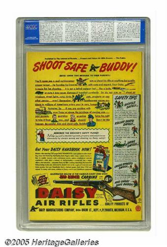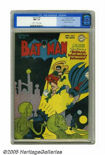 <B>Batman #41 Mile High pedigree (DC, 1947) CGC NM+ 9.6 Off-white to white pages.</B></I> What Batman fan wouldn't love this one? First of all, the zany "little green men" scene is this title's first science fiction cover -- what became a common sight during the 1950s was quite a novelty in 1947. The cover and interior art are by Jim Mooney. Then there's a Penguin appearance, in which the Man of a Thousand Umbrellas announces that he's opening a bird shop and going straight from now on. If you guessed that's just a ruse to cover up his latest crime spree, you know your Penguin! Jim Mooney drew the cover as well as both of the Batman stories. This Mile High copy is tied for the highest grade that CGC has assigned to date, and considering this issue's black cover, don't count on finding a better one. Overstreet 2005 NM- 9.2 value = $1,075. CGC census 2/05: 2 in 9.6, none higher.