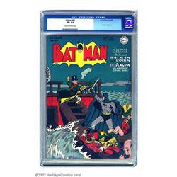 Batman #43 (DC, 1947) CGC VF+ 8.5 Cream to off-white pages. If you're holding out for a Near Mint copy of this issue, good luck! CGC hasn't seen one yet, as of the most recent census available. In fact, only one of the several of this issue that have been graded was deemed a better copy. Really nice colors on this cover, and still looking ever so fresh and supple. The everlovin' Penguin spices up this issue. Overstreet 2002 VF 8.0 value = $669. Important notice: We expect to be auctioning lots at the rate of 200-250 per hour. Sometimes eBay Premier live bid software cannot keep up with that pace, so we strongly recommend that you place a realistic proxy bid now as insurance to avoid disappointment. Also please note that all Heritage/CAA lots purchased through eBay Premier carry a 20% Buyer's Premium. Please make sure you read the Terms and Conditions.