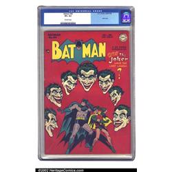 Batman #44 (DC, 1947) CGC VF+ 8.5 Off-white pages. Batman's greatest and most colorful arch-enemy has always been the Joker and here's an opportunity to acquire a copy of Batman with a Joker cover and story. Bright primary colors of red, yellow, green, and blue accentuate this classic cover by Jim Mooney and Charles Paris. There are a couple of minor imperfections on the edge of the spine and some light stressing that make this book a VF+, but this tight, flat copy has sharp corners and the attractiveness of a much higher-graded copy. Overstreet 2002 VF 8.0 value = $937. Important notice: We expect to be auctioning lots at the rate of 200-250 per hour. Sometimes eBay Premier live bid software cannot keep up with that pace, so we strongly recommend that you place a realistic proxy bid now as insurance to avoid disappointment. Also please note that all Heritage/CAA lots purchased through eBay Premier carry a 20% Buyer's Premium. Please make sure you read the Terms and Conditions.