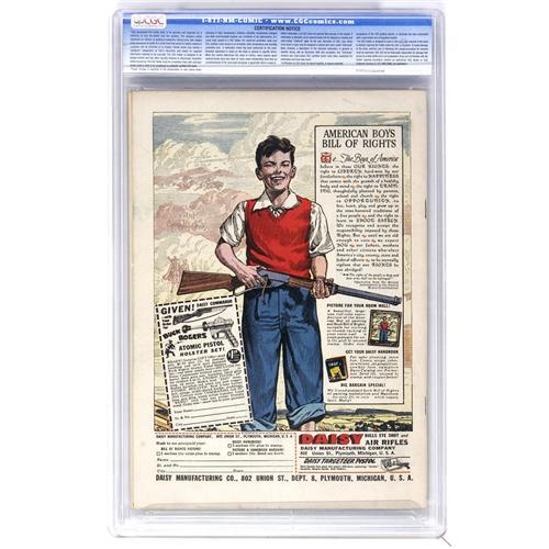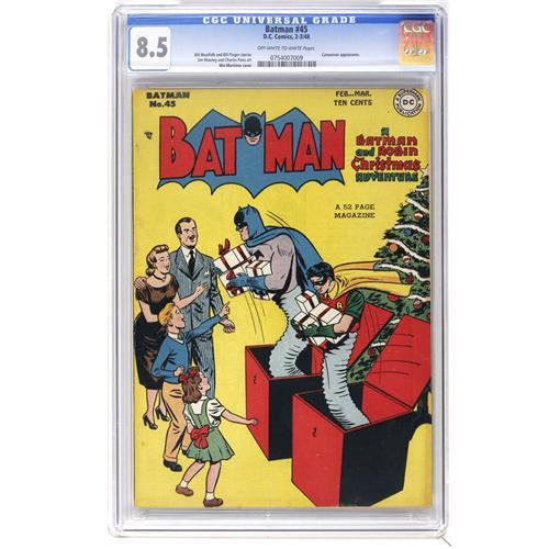 <B>Batman #45 (DC, 1948) CGC VF+ 8.5 Off-white to white pages.</B></I> This copy's tied for the highest grade that CGC has yet assigned. A Catwoman story drawn by Charles Paris is the highlight of the book, but there's also a Christmas story, and of course Win Mortimer's Yuletide cover. Overstreet 2006 VF 8.0 value = $519; VF/NM 9.0 value = $822. CGC census 7/06: 3 in 8.5, none higher. <BR><BR><B>Important notice:</B> Heritage usually auctions material at the rate of 200-250 lots per hour. On some occasions eBay Live bid software or the Internet may not be able to keep up with the pace of the auction. We recommend placing a realistic absentee bid now as insurance to avoid disappointment. Occasionally the auctioneer may eliminate or reject an eBay Live bid, and the auctioneer may also reopen a lot after the close of the eBay live bidding (usually because we missed an audience bid), and may reject your bid even if it shows you as the winning bidder. By bidding via eBay Live, you agree that Heritage may award the lot to another bidder at its sole discretion under the circumstances described above or any other reasonable circumstances. Since eBay bids are not shown to us until we open the lot on the floor, we treat those bids just like floor bids. In most cases the floor responds before the eBay bid is presented to us, due to Internet lag time, so for consistency we have made it a policy that floor bids are always considered first over tie eBay live bids. Also please note that all Heritage lots purchased through eBay Live carry a 22.5% Buyer's Premium. Please make sure you read the Terms and Conditions before you bid. This lot is being auctioned in conjunction with a live floor auction by Heritage Auction Galleries. All final auction and invoice information will be supplied by Heritage Auction Galleries, and all other information should be considered preliminary. Lot:41001 <BR><BR><B>Winning Notification and Billing:</B> After the FINAL session in this auction is complete, Heritage will send e-mail and snail mail invoices. This process normally takes several days. All final auction and invoice information will be supplied by Heritage Auction Galleries, and all other information should be considered preliminary. <BR><BR>This auction will be conducted on a live auction floor and over the Internet through eBay Live. If you choose to place an absentee bid, please take a moment to <font color='#0000ff'><u><a href='http://pages.ebay.com/liveauctions/help/before/laabsentee.html'>learn how eBay Live absentee bidding works</a></u></font><font color='#000000'>
