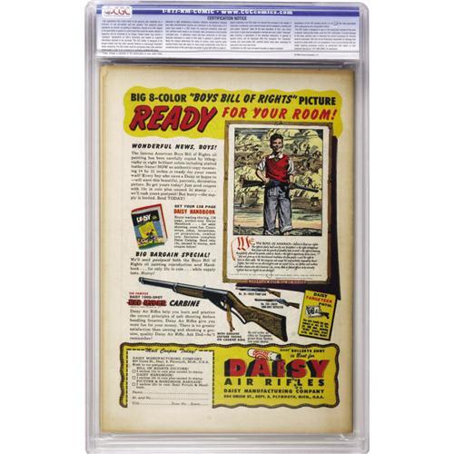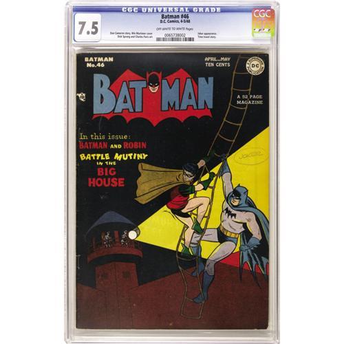 <B>Batman #46 (DC, 1948) CGC VF- 7.5 Off-white to white pages.</B></I> The dark cover means this is a tough book to find in higher grades, and, in fact, this comes mighty close to the highest-graded copy CGC has reviewed to date, a VF+ 8.5. That one and a VF 8.0 are the only copies keeping this one from the top of CGC's census. In this issue the Joker makes an appearance, and a time travel story is featured. The cover is by Win Mortimer, with Dick Sprang helping with story artwork. Overstreet 2006 VF 8.0 value = $519. CGC census 10/06: 3 in 7.5, 2 higher.<BR><BR><b>Shipping:</b> Slabbed Comic (<a target="_blank" href="http://www.heritageauctions.com/common/shipping.php">view shipping information</a>)