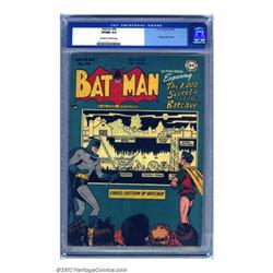 Batman #48 (DC, 1948) CGC VF/NM 9.0 Off-white to white pages. Here's yet another "best copy of this issue graded to date by CGC" for your perusal. "The 1,000 Secrets of the Batcave" is promoted on this cover by Win Mortimer, and it's one of the more popular Batman covers of the entire run! See why. Overstreet 2002 NM 9.4 value = $1,175. Important notice: We expect to be auctioning lots at the rate of 200-250 per hour. Sometimes eBay Premier live bid software cannot keep up with that pace, so we strongly recommend that you place a realistic proxy bid now as insurance to avoid disappointment. Also please note that all Heritage/CAA lots purchased through eBay Premier carry a 20% Buyer's Premium. Please make sure you read the Terms and Conditions.