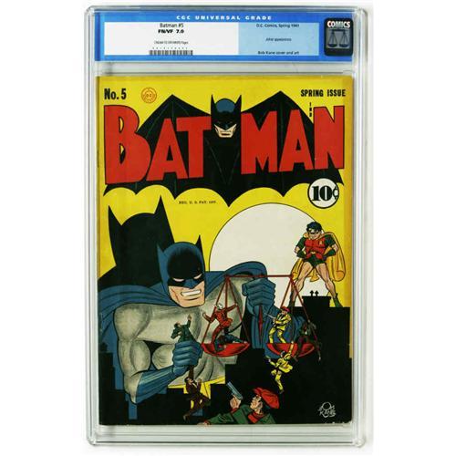 <B>Batman #5 (DC, 1941) CGC FN/VF 7.0 Cream to off-white pages.</B></I> The Caped Crusader and Boy Wonder tip the scales of justice in their favor on this early cover by creator Bob Kane. This issue features a Joker appearance, but more importantly it's the first time we see the Batmobile with its bat-head front. Kane and Jerry Robinson shared interior art chores. Overstreet 2005 FN 6.0 value = $1,452; VF 8.0 value = $3,388. CGC census 11/05: 6 in 7.0, 19 higher.