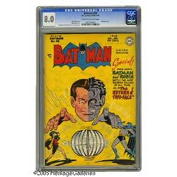 <B>Batman #50 (DC, 1948) CGC VF 8.0 Cream to off-white pages.</B></I> Bob Kane created the Two-Face cover for this issue, copies of which have managed grades higher than 8.5 from CGC on just two occasions to date. Overstreet 2004 VF 8.0 value = $575. CGC census 1/05: 1 in 8.0, 3 higher. <I>From the Northern Lights Collection</B></I>.