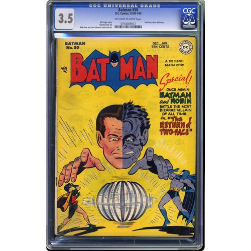 <B>Batman #50 (DC, 1948) CGC VG- 3.5 Off-white to white pages.</B></I> A Two-Face impostor appears. Bob Kane and Lew Schwartz cover and art. Overstreet 2006 VG 4.0 value = $186. CGC census 3/06: 3 in 3.5, 15 higher. <I>From the Collection of Harold Curtis.</B></I>