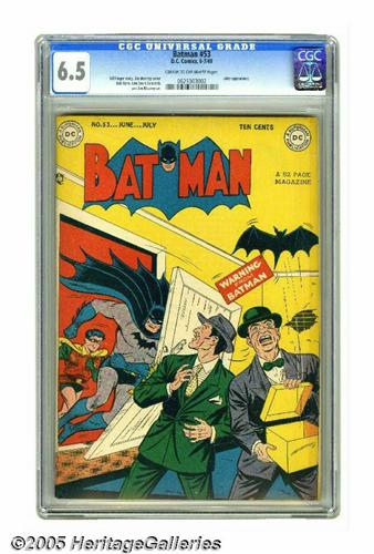 <B>Batman #53 (DC, 1949) CGC FN+ 6.5 Cream to off-white pages.</B></I> That Funny Man of Felony, the Joker, is back in this issue, and this time the theme for his crime spree is objects that begin with "ha" or "ho" (as in ha-ha and ho-ho, get it?). The Dynamic Duo are, as always, not amused. The issue has a Jim Mooney cover, with interior art by Mooney, Bob Kane, and Lew Schwartz. Overstreet 2005 FN 6.0 value = $255; VF 8.0 value = $531. CGC census 3/05: 2 in 6.5, 8 higher. <I>From the Northern Lights Collection.</B></I>