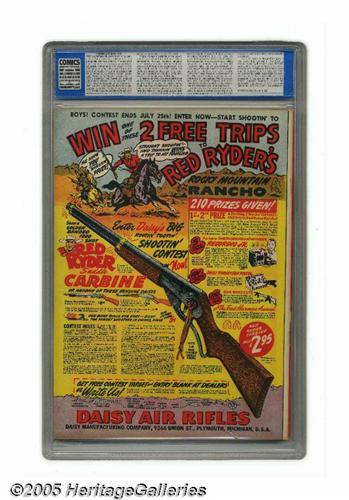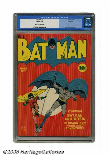 <B>Batman #6 Allentown pedigree (DC, 1941) CGC NM+ 9.6 Off-white to white pages.</B></I> If you wonder why people make such a fuss about pedigree collections, a look at this stunning Allentown book will tell you how nice a comic can look if handled with the utmost care over many decades. It's a superb showcase for a Jerry Robinson cover that's a collector's favorite in any condition. If only the best will do, this qualifies on every level; one of the icons among superheroes, historical significance, eye-catching cover by one of the premier Golden Age artists, respected pedigree, and the highest-graded copy of the issue that CGC has reviewed to date. Truly one of the rare gems in this auction. Note that a small plastic stabilizing peg is loose inside the CGC holder, not affecting the comic or the integrity of the holder. Overstreet 2005 NM- 9.2 value = $6,500. CGC census 2/05: 1 in 9.6, none higher.