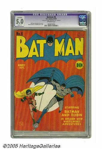 <B>Batman #6 (DC, 1941) CGC Apparent VG/FN 5.0 Slight (P) Off-white pages.</B></I> Bob Kane and Jerry Robinson teamed up for both the cover and the interior art of this issue. CGC notes, "Restoration includes: cover cleaned, cover reinforced." Overstreet 2005 GD 2.0 value = $423; VG 4.0 value = $846; FN 6.0 value = $1,269. <I>From the Northern Lights Collection.</B></I>