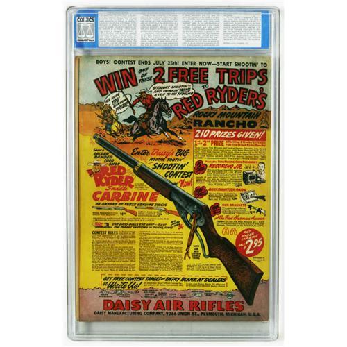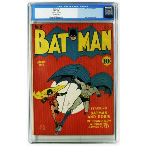 <B>Batman #6 (DC, 1941) CGC VF 8.0 Off-white pages.</B></I> Batman and Robin swing into action once again on this cover by creator Bob Kane and Jerry Robinson, which promises "brand new whirlwind adventures" in this issue. What kid in the 1940s could say no to that? The dynamic art duo of Kane and Robinson also handled interiors. CGC notes, "Small tear on 1st 8 pages." Overstreet 2005 VF 8.0 value = $2,936. CGC census 11/05: 8 in 8.0, 9 higher.