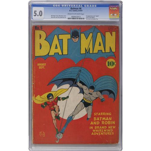 <B>Batman #6 (DC, 1941) CGC VG/FN 5.0 Cream to off-white pages.</B></I> Bob Kane drew the cover of this early issue. Overstreet 2006 VG 4.0 value = $850; FN 6.0 value = $1,275. CGC census 3/07: 3 in 5.0, 40 higher.<BR><BR><b>Shipping:</b> Comics - Slabbed (certified) (<a target=""_blank"" href=""http://www.heritageauctions.com/common/shipping.php"">view shipping information</a>)