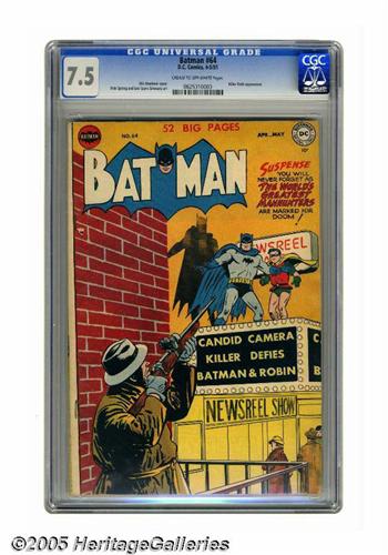 <B>Batman #64 (DC, 1951) CGC VF- 7.5 Cream to off-white pages.</B></I> Batman and Robin face "The Candid Camera Killer!" No, Allen Funt didn't turn homicidal, rather it's a crazed millionaire whose gun shoots people and also photographs them at the same time. The Dynamic Duo not only have to thwart that sicko in this issue, they also take on supervillain Killer Moth. The issue has a Win Mortimer cover and Dick Sprang art. Overstreet 2005 VF 8.0 value = $388. CGC census 4/05: 2 in 7.5, 7 higher. <I>From the Northern Lights Collection.</B></I>