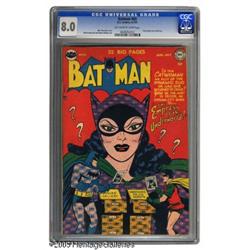 <B>Batman #65 (DC, 1951) CGC VF 8.0 Off-white to white pages.</B></I> Striking, colorful Catwoman cover by Win Mortimer makes this issue stand out. Dick Sprang contributes interior art. Overstreet 2004 VF 8.0 value = $463. CGC census 1/05: 1 in 8.0; 2 higher. <I>From the Northern Lights Collection.</B></I>