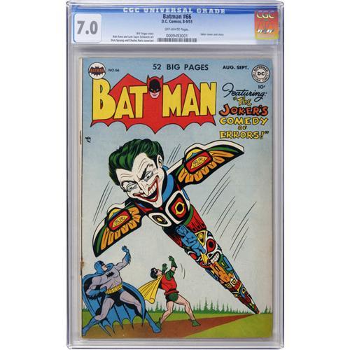 <B>Batman #66 (DC, 1951) CGC FN/VF 7.0 Off-white pages.</B></I> When the Joker botches a robbery attempt, does it make him mad? No, it just gives him an idea for a new crime spree, this time based on the great errors of history! That's not all this 52-pager has to offer, though: there's also a tale centered on Commissioner Gordon in which Batman has to pose as Gordon to trap a criminal. And if you're wondering what Overstreet's cryptic notation "Pre-2nd Batman & Robin team try-out" is all about, it refers to another backup feature, in which Robin dreams of becoming the new Batman in the future and having a sidekick of his own, an "imaginary" concept that would later be revisited. The Joker cover is by Dick Sprang. Overstreet 2006 FN 6.0 value = $255; VF 8.0 value = $531. CGC census 3/07: 3 in 7.0, 15 higher. <I> From the Warren Hall Collection.</B></I><BR><BR><b>Shipping:</b> Comics - Slabbed (certified) (<a target="_blank" href="http://www.heritageauctions.com/common/shipping.php">view shipping information</a>)