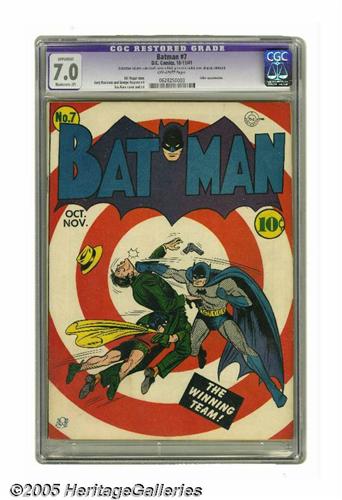 <B>Batman #7 (DC, 1941) CGC Apparent FN/VF 7.0 Moderate (P) Off-white pages.</B></I> Combine a bullseye cover and a Joker appearance, and you've got one great Batman issue. The Joker story climaxes in a face off between the Dynamic Duo and the Leonardo of the Larcenous Laugh himself -- atop a moving train, no less. The book has a Bob Kane cover and Kane, Jerry Robinson, and George Roussos art. CGC notes, "Restoration includes: color touch, pieces added, spine splits sealed, cover cleaned, reinforced." Overstreet 2005 GD 2.0 value = $423; VG 4.0 value = $846; FN 6.0 value = $1,269; VF 8.0 value = $2,856. <I>From the Northern Lights Collection.</B></I>