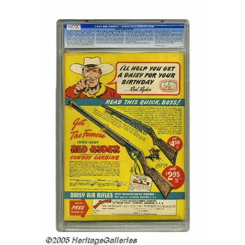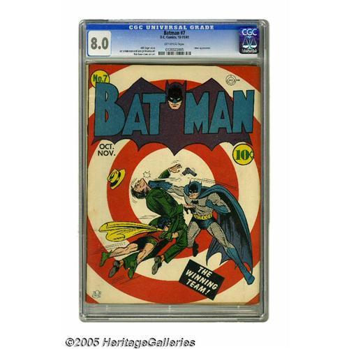 <B>Batman #7 (DC, 1941) CGC VF 8.0 Off-white pages.</B></I> The early issues of the title were characterized by some of the most dynamic covers in the entire run. This one's by Bob Kane, who also provided interior art, along with Jerry Robinson and George Roussos. The Joker makes his fourth appearance in seven issues. This is about as nice a copy as you'll find. Although a few copies rank ahead of our offering in CGC's current census, the highest grade yet assigned is a not-much-better VF/NM 9.0. Overstreet 2005 VF 8.0 value = $2,936. CGC census 7/05: 4 in 8.0, 6 higher. <I>From the Aviator Collection</B></I>. <BR><BR><B>Important notice:</B> Heritage usually auctions material at the rate of 200-250 lots per hour. On some occasions eBay Live bid software or the Internet may not be able to keep up with the pace of the auction. We recommend placing a realistic absentee bid now as insurance to avoid disappointment. Occasionally the auctioneer may eliminate or reject an eBay Live bid, and the auctioneer may also reopen a lot after the close of the eBay live bidding (usually because we missed an audience bid), and may reject your bid even if it shows you as the winning bidder. By bidding via eBay Live, you agree that Heritage may award the lot to another bidder at its sole discretion under the circumstances described above or any other reasonable circumstances. Since eBay bids are not shown to us until we open the lot on the floor, we treat those bids just like floor bids. In most cases the floor responds before the eBay bid is presented to us, due to Internet lag time, so for consistency we have made it a policy that floor bids are always considered first over tie eBay live bids. Also please note that all Heritage lots purchased through eBay Live carry a 20% Buyer's Premium. Please make sure you read the Terms and Conditions before you bid. This lot is being auctioned in conjunction with a live floor auction by Heritage Galleries & Auctioneers. All final auction and inv