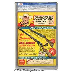 <B>Batman #7 (DC, 1941) CGC VG/FN 5.0 Cream to off-white pages.</B></I> The Joker's wild in this early Batman issue! Oddly, the Mad Harlequin of Hate didn't make the cover, but the Dynamic Duo got a warm-up by punching out a no-name hood on this bullseye cover by Bob Kane. The book has art by Kane, Jerry Robinson, and George Roussos. CGC notes, "Centerfold detached." Overstreet 2004 VG 4.0 value = $846; FN 6.0 value = $1,269. <BR><BR><B>Important notice:</B> Heritage usually auctions material at the rate of 200-250 lots per hour. On some occasions eBay Live bid software or the Internet may not be able to keep up with the pace of the auction. We recommend placing a realistic absentee bid now as insurance to avoid disappointment. Occasionally the auctioneer may eliminate or reject an eBay Live bid, and the auctioneer may also reopen a lot after the close of the eBay live bidding (usually because we missed an audience bid), and may reject your bid even if it shows you as the winning bidder. By bidding via eBay Live, you agree that Heritage may award the lot to another bidder at its sole discretion under the circumstances described above or any other reasonable circumstances. Since eBay bids are not shown to us until we open the lot on the floor, we treat those bids just like floor bids. In most cases the floor responds before the eBay bid is presented to us, due to Internet lag time, so for consistency we have made it a policy that floor bids are always considered first over tie eBay live bids. Also please note that all Heritage lots purchased through eBay Live carry a 20% Buyer's Premium. Please make sure you read the Terms and Conditions before you bid.