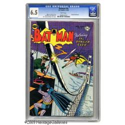 <B>Batman #76 (DC, 1953) CGC FN+ 6.5 White pages.</B></I> The Penguin waddles in for an appearance in this issue, which sports a Dick Sprang/Charles Paris cover. This copy barely misses being CGC's highest-graded issue #76 to date (7.0 to 6.5). Overstreet 2004 FN 6.0 value = $183; VF 8.0 value = $381. CGC census 1/05: 3 in 6.5; 1 higher. <I>From the Northern Lights Collection.</B></I>