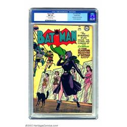 Batman #84 Double cover (DC, 1954) CGC NM 9.4 Off-white pages. This would be a cool issue to procure in any complete condition, what with Catwoman inside and out, and lovable Two-Face looming to harass the Dynamic Duo. But here we also have a near-perfect (NM) copy and a double cover. The outer cover grades at VF 8.0, and the inner goes NM 9.4. Gird your loins and enter the bidding fray! Overstreet 2002 NM 9.4 value = $800. Important notice: We expect to be auctioning lots at the rate of 200-250 per hour. Sometimes eBay Premier live bid software cannot keep up with that pace, so we strongly recommend that you place a realistic proxy bid now as insurance to avoid disappointment. Also please note that all Heritage/CAA lots purchased through eBay Premier carry a 20% Buyer's Premium. Please make sure you read the Terms and Conditions.