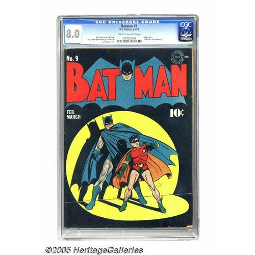 <B>Batman #9 (DC, 1942) CGC VF 8.0 Cream to off-white pages.</B></I> One of the best-known Batman covers of all is this one here by Jack Burnley! Inside the issue, the Joker busts out of jail and wastes no time cooking up a money-laundering scheme which only the Dynamic Duo can (try to) foil. This issue also has the very first Batman Christmas story. The interior artists include Jerry Robinson and George Roussos. Overstreet 2005 VF 8.0 value = $2,243. CGC census 7/05: 6 in 8.0, 4 higher. <I>From the Aviator Collection</B></I>. <BR><BR><B>Important notice:</B> Heritage usually auctions material at the rate of 200-250 lots per hour. On some occasions eBay Live bid software or the Internet may not be able to keep up with the pace of the auction. We recommend placing a realistic absentee bid now as insurance to avoid disappointment. Occasionally the auctioneer may eliminate or reject an eBay Live bid, and the auctioneer may also reopen a lot after the close of the eBay live bidding (usually because we missed an audience bid), and may reject your bid even if it shows you as the winning bidder. By bidding via eBay Live, you agree that Heritage may award the lot to another bidder at its sole discretion under the circumstances described above or any other reasonable circumstances. Since eBay bids are not shown to us until we open the lot on the floor, we treat those bids just like floor bids. In most cases the floor responds before the eBay bid is presented to us, due to Internet lag time, so for consistency we have made it a policy that floor bids are always considered first over tie eBay live bids. Also please note that all Heritage lots purchased through eBay Live carry a 20% Buyer's Premium. Please make sure you read the Terms and Conditions before you bid. This lot is being auctioned in conjunction with a live floor auction by Heritage Galleries & Auctioneers. All final auction and invoice information will be supplied by Heritage Galleries & Auctioneers, and all other