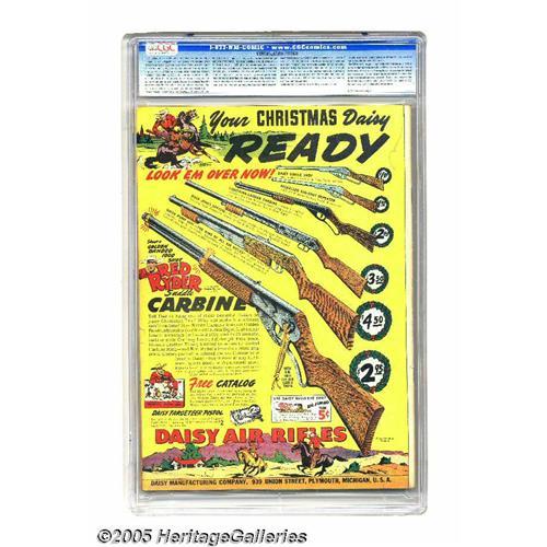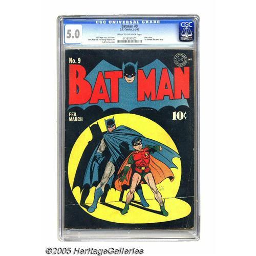 <B>Batman #9 (DC, 1942) CGC VG/FN 5.0 Cream to off-white pages.</B></I> A classic cover by Jack Burnley leads off this issue; inside there's a Joker appearance as well as the first Batman Christmas story. Overstreet 2005 VG 4.0 value = $690; FN 6.0 value = $1,035. CGC census 7/05: 3 in 5.0, 22 higher. <I>From the Aviator Collection</B></I>. <BR><BR><B>Important notice:</B> Heritage usually auctions material at the rate of 200-250 lots per hour. On some occasions eBay Live bid software or the Internet may not be able to keep up with the pace of the auction. We recommend placing a realistic absentee bid now as insurance to avoid disappointment. Occasionally the auctioneer may eliminate or reject an eBay Live bid, and the auctioneer may also reopen a lot after the close of the eBay live bidding (usually because we missed an audience bid), and may reject your bid even if it shows you as the winning bidder. By bidding via eBay Live, you agree that Heritage may award the lot to another bidder at its sole discretion under the circumstances described above or any other reasonable circumstances. Since eBay bids are not shown to us until we open the lot on the floor, we treat those bids just like floor bids. In most cases the floor responds before the eBay bid is presented to us, due to Internet lag time, so for consistency we have made it a policy that floor bids are always considered first over tie eBay live bids. Also please note that all Heritage lots purchased through eBay Live carry a 20% Buyer's Premium. Please make sure you read the Terms and Conditions before you bid. This lot is being auctioned in conjunction with a live floor auction by Heritage Galleries & Auctioneers. All final auction and invoice information will be supplied by Heritage Galleries & Auctioneers, and all other information should be considered preliminary. Lot:3027 <BR><BR><B>Winning Notification and Billing:</B> After the FINAL session in this auction is complete, Heritage will send e-mail and sna