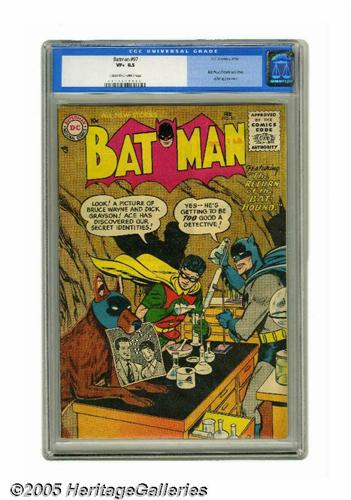 <B>Batman #97 (DC, 1956) CGC VF+ 8.5 Cream to off-white pages.</B></I> The second appearance of Ace the Bat-Hound (with cover billing, no less) makes this issue a must for Batman Family aficionados. But there's more, including a story featuring that Jeering Jester of Crime himself, the Joker! This issue is from the period when superheroes weren't in vogue, and as such it's less often seen than issues from other eras. Our copy is the highest-graded one that CGC has certified to date, and the only one graded above 7.5. Overstreet 2005 VF 8.0 value = $311; VF/NM 9.0 value = $473. CGC census 1/05: 1 in 8.5, none higher. <I>From the Northern Lights Collection.</B></I>