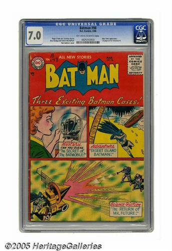 <B>Batman #98 (DC, 1956) CGC FN/VF 7.0 Off-white to white pages.</B></I> Win Mortimer cover. Dick Sprang and Sheldon Moldoff art. Overstreet 2005 FN 6.0 value = $153; VF 8.0 value = $311. CGC census 3/05: 1 in 7.0, 7 higher. <I>From the Northern Lights Collection.</B></I>