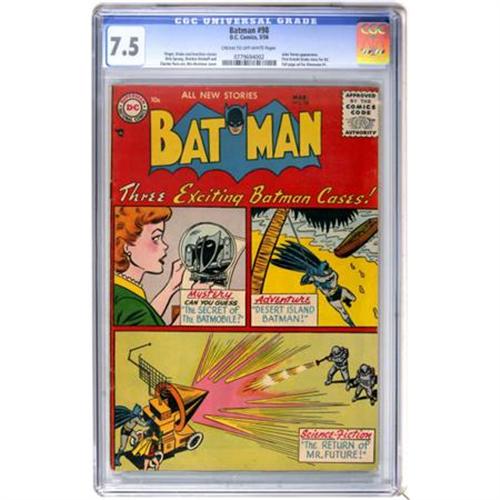 <B>Batman #98 (DC, 1956) CGC VF- 7.5 Cream to off-white pages.</B></I> Win Mortimer cover. Dick Sprang and Sheldon Moldoff art. Overstreet 2007 VF 8.0 value = $317. CGC census 6/07: 3 in 7.5, 6 higher.<BR><BR><b>Shipping:</b> Comics - Slabbed (certified) (<a target="_blank" href="http://www.heritageauctions.com/common/shipping.php">view shipping information</a>)