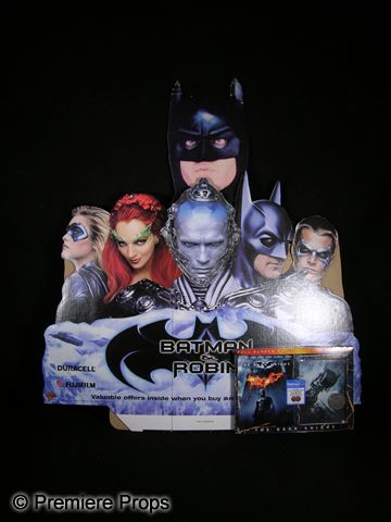 Michael Keaton Batman VHS ad display from 1989, depicting a die-cut upper half of Keaton's Batman costume. This lot further includes a Batman and Robin VHS display for use on shelves depicting Batman, Robin, Mr. Freeze, Poison Ivy and Batgirl. As an added bonus, also included is a collector's edition DVD of The Dark Knight complete with comic book and collectible coin, still in the box. (VHS Display 29.5x24, Keaton 33x22, DVD Set 11x8)