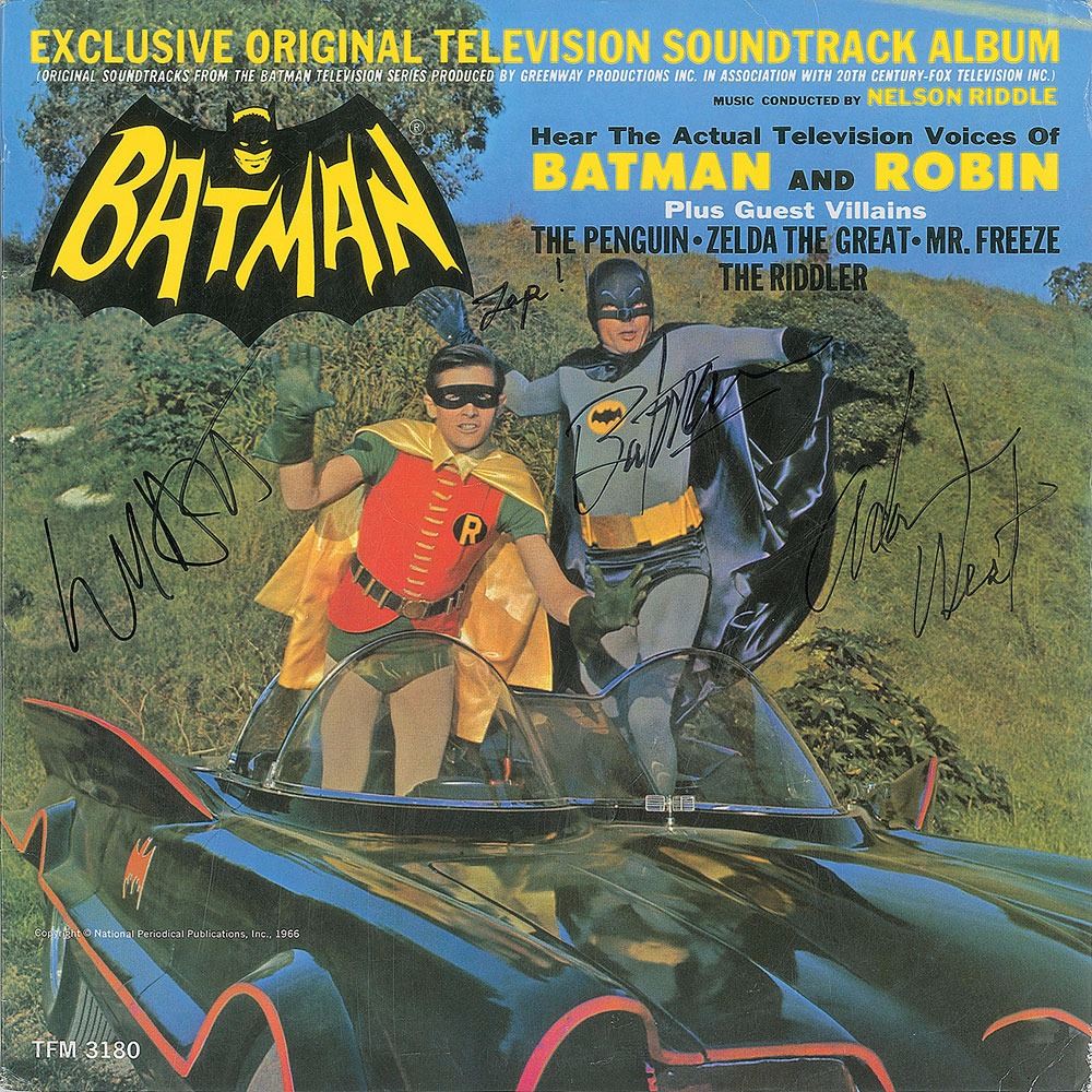 Batman television soundtrack album signed on the front cover in black felt tip by West, who adds "WHAM," "Zap!," and "Batman" near his image. In fine condition, with clean separation along the top seam. The record is included.