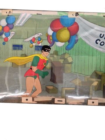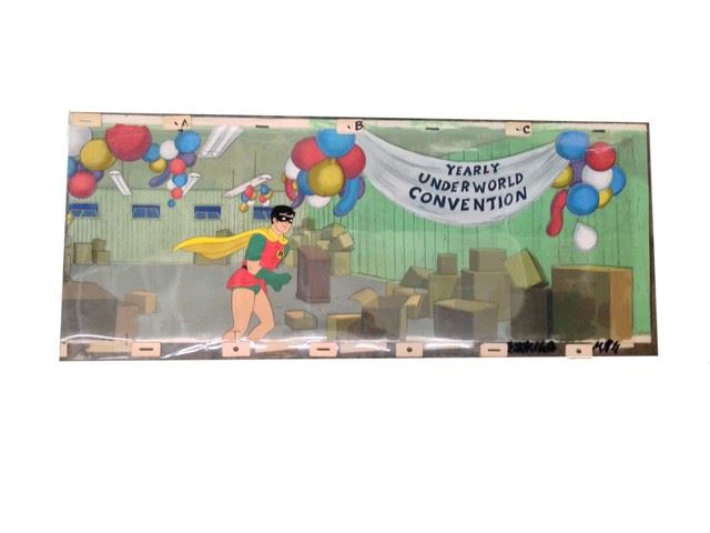 "Batman" Animation Pan (featuring "Robin" at the underworld convention / includes original hand painted background / 1974 / Filmation Studios / 27" x 10.5")