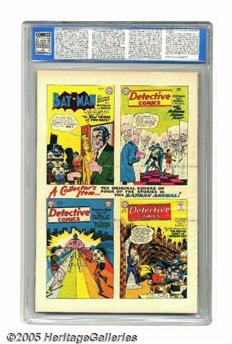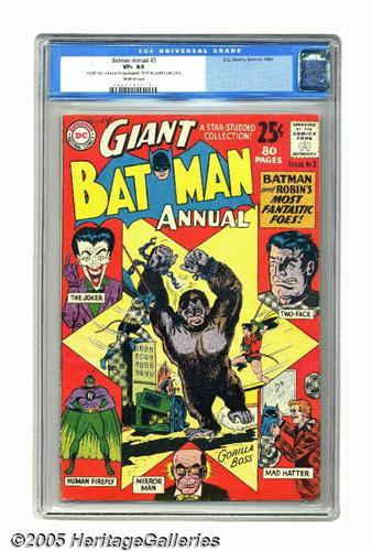 <B>Batman Annual #3 (DC, 1962) CGC VF+ 8.5 Off-white pages.</B></I> The Joker and Two-Face appear. 80 pages. CGC notes, "'BIF VI/14/62' written on 1st page in pencil. '6-14' on cover in grease pencil." Overstreet 2005 VF 8.0 value = $223; VF/NM 9.0 value = $342. CGC census 5/05: 1 in 8.5, 4 higher.