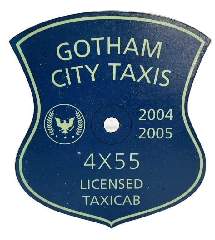 Original Gotham police taxi license tag used in the Christopher Nolan directed superhero film 'Batman Begins' (2005), where, after training with his mentor, Batman begins his fight to free crime-ridden Gotham City from corruption.