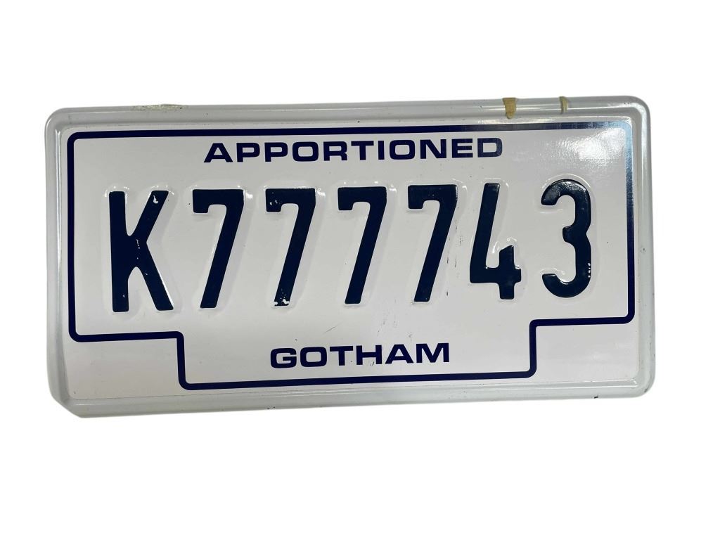 Original Gotham license plate used in the Christopher Nolan directed superhero film 'Batman Begins' (2005), where, after training with his mentor, Batman begins his fight to free crime-ridden Gotham City from corruption.