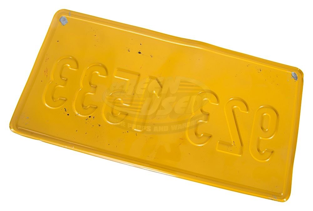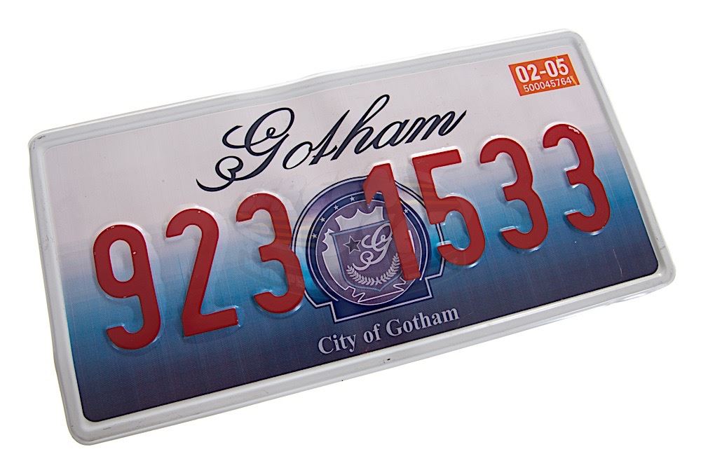 (Warner Bros., 2005) This prop license plate was custom-made by the production for use on various vehicles during filming. The plate is made of metal and features raised numbers over the Gotham City crest. Some wear from use is present.