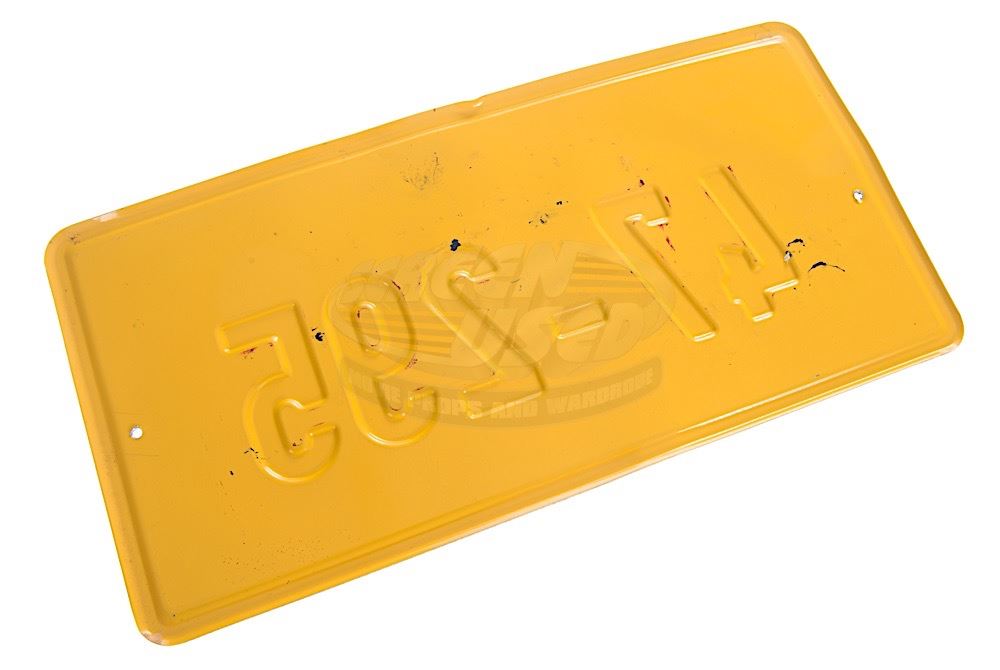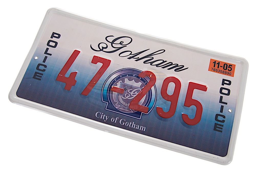 (Warner Bros., 2005) This prop license plate was custom-made by the production for use on various police vehicles during filming. The plate is made of metal and features raised numbers over the Gotham City crest. Some wear from use is present.