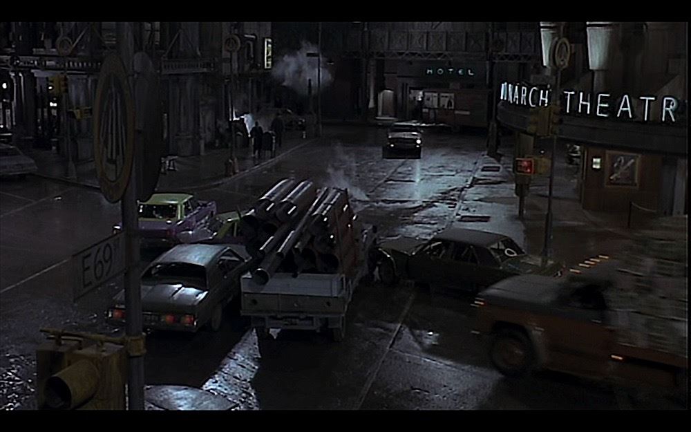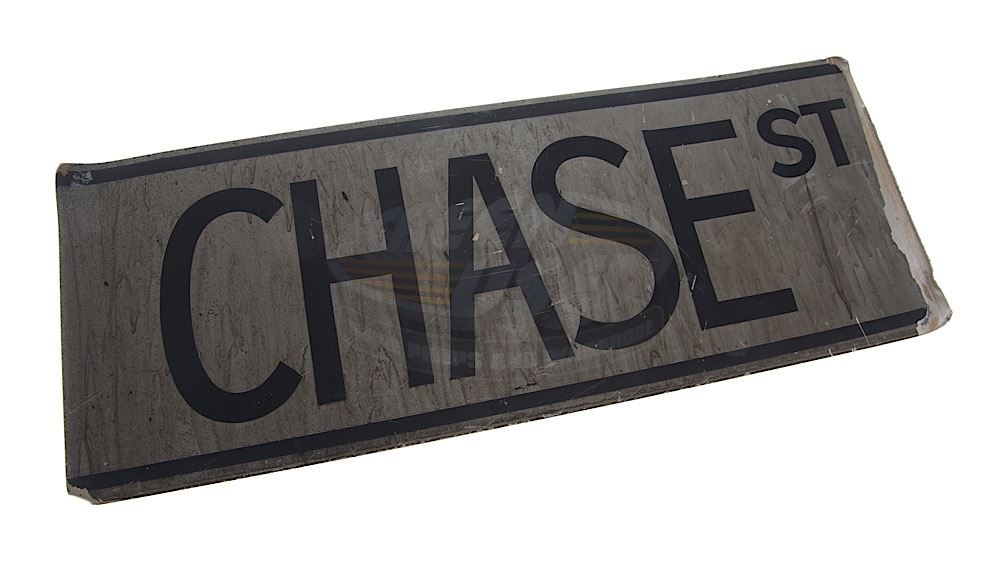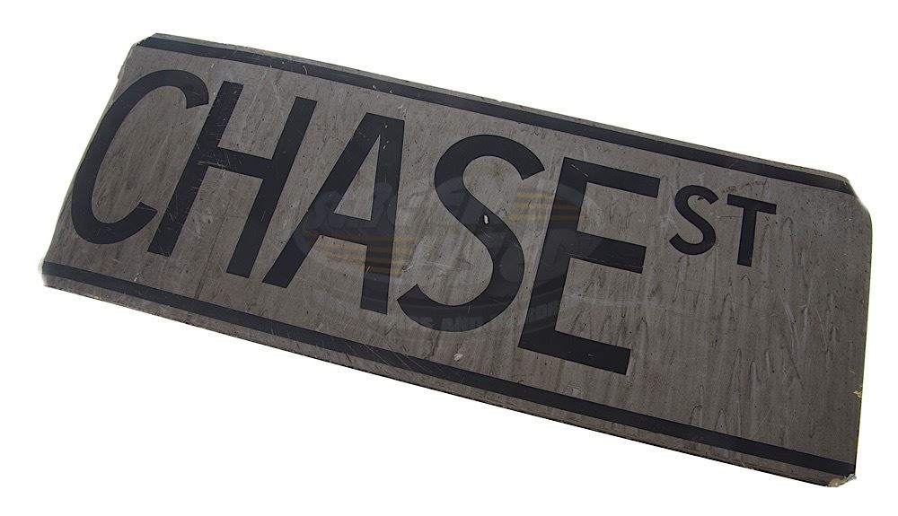 (Warner Bros., 1989) The prop street sign was custom-made by the production for use as set dressing on the Pinewood Studios backlot. This sign is an example of a movie Easter Egg, as it was made for the street which features the Batmobile being chased by the Joker's goons. The sign is made of metal, hand painted and weathered on both sides, giving it the worn down Gotham City appearance. Wear from use and storage is present, measures 23.25" x 9".