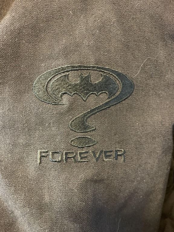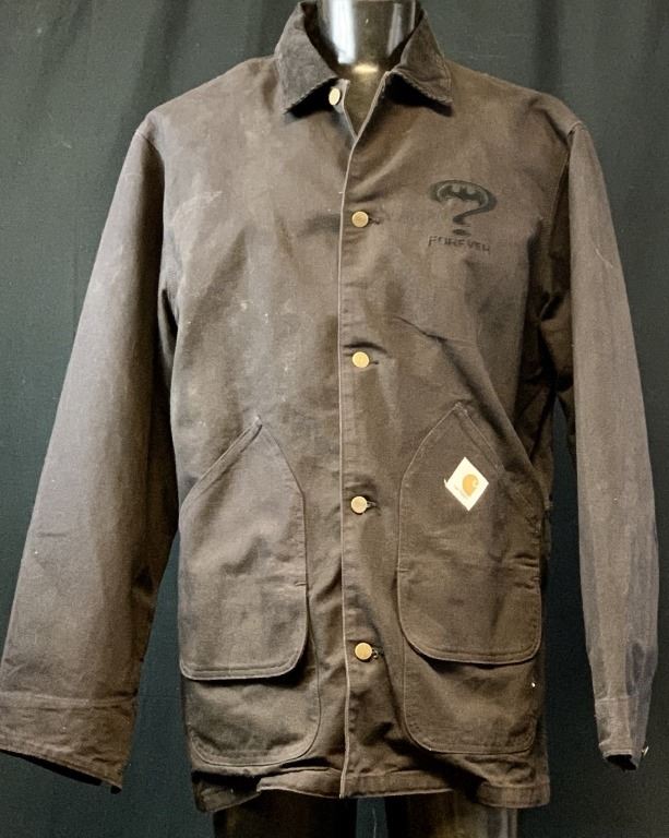 Original Carhartt jacket given to the cast and crew of the superhero film "Batman Forever" (1995) directed by Joel Schumacher, where Batman must battle former district attorney Harvey Dent, who is now Two-Face and Edward Nygma, The Riddler with help from an amorous psychologist and a young circus acrobat who becomes his sidekick, Robin.