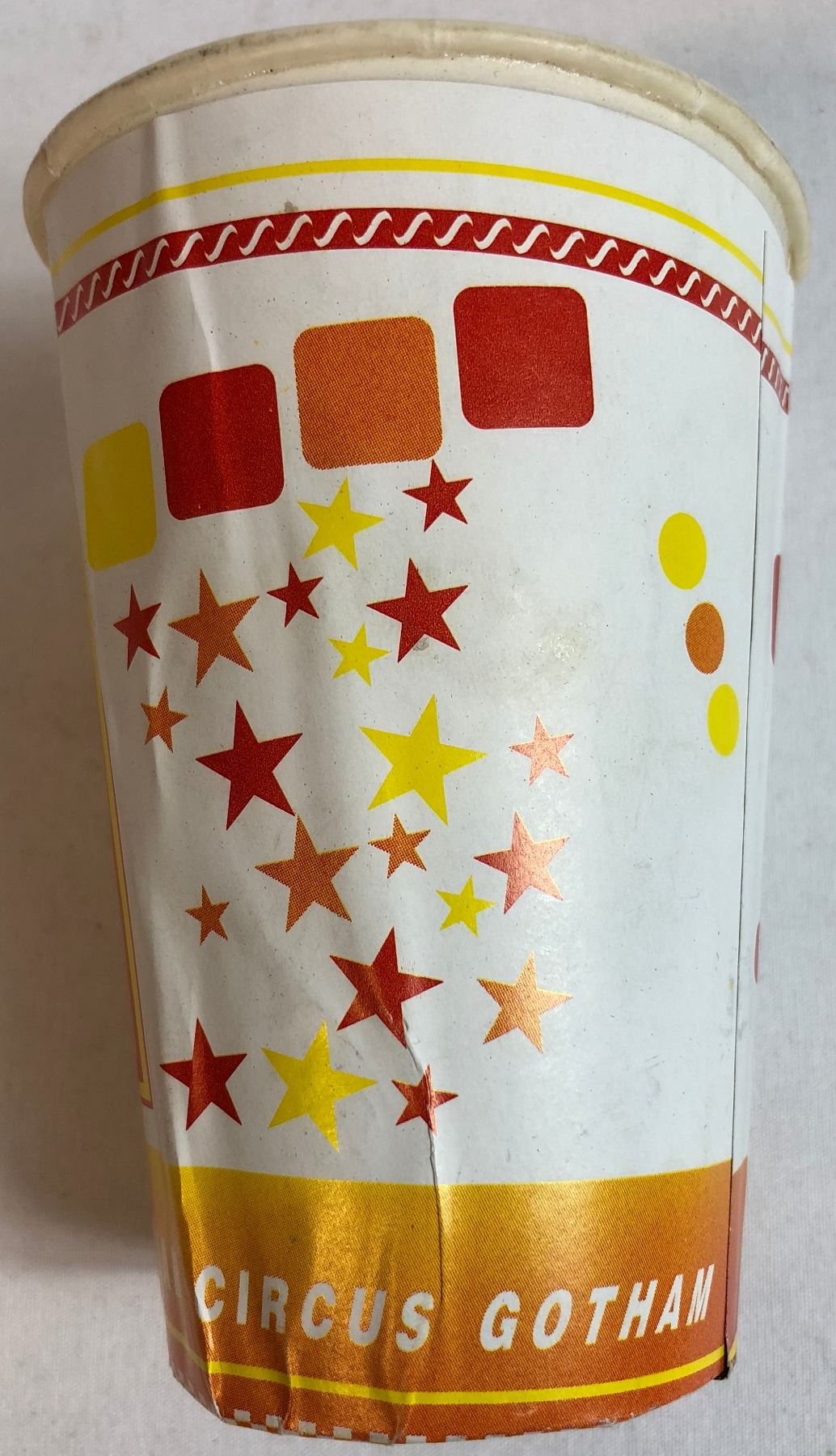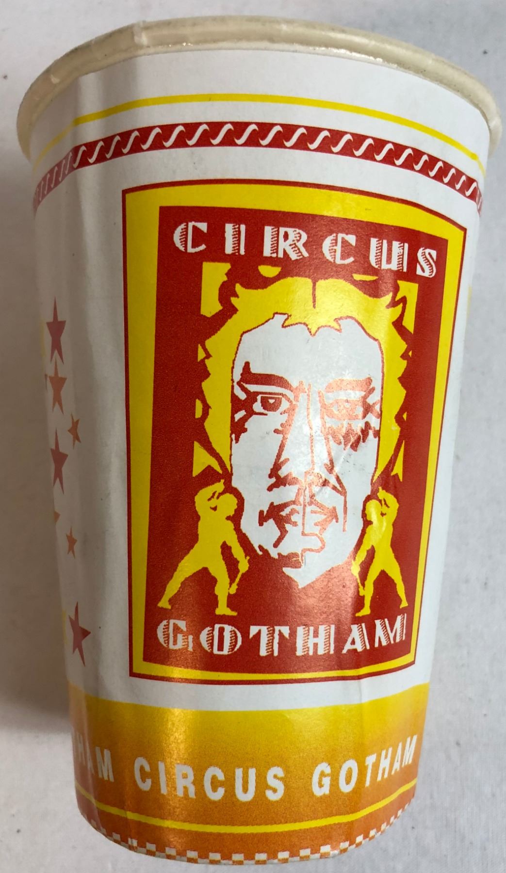 Screen used circus paper cup used in the production of Batman Forever (1995), the superhero movie where, Batman must battle former district attorney Harvey Dent, who is now Two-Face and Edward Nygma, The Riddler with help from an amorous psychologist and a young circus acrobat who becomes his sidekick, Robin.