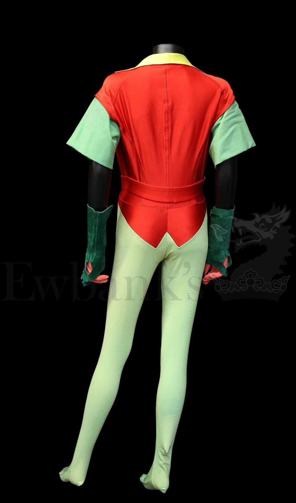 † Batman Forever (1995) 'Robin' (Chris O'Donnell) costume. The character, Richard (Dick) Grayson, is first introduced in the movie, wearing this costume, as part of the high wire family Circus act called 'The Flying Graysons'. The key dramatic sequence ends with the death of his family caused by 'Two Face'. Subsequently he wears the costume, with the addition of the eye mask, to rescue Batman and the costume is also seen, folded neatly, within the 'Batcave' costume storage room. Comprises of a tailored one piece bodysuit, gloves with separate buckled 'gauntlets', belt with buckle and an Eye Mask. Bodysuit exhibits mild discoloration to the legs due to production use and one of the metal chest clasps is loose. Please note that VAT is payable on top of the hammer price at 20% in addition to standard buyers premium inc. VAT for this lot.