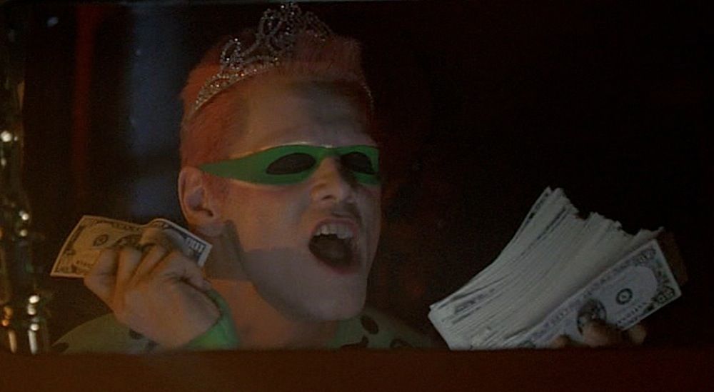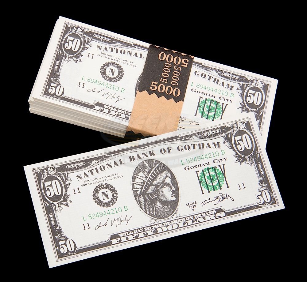 (Warner Bros., 1995) This bundle of prop fifty dollar bills were custom-printed by the production for use by various actors and as set dressing. Each bill features the image of the statue of liberty and are issued by the National Bank of Gotham City.