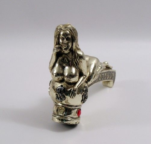 Batman Forever Car Ornament Prop - Joel Schumacher created a Batman perhaps closest to the feel of the original comics in "Batman Forever" (1995) with Val Kilmer as the cape crusader, and Jim Carrey as The Joker. This is a metal woman car ornament used as a background set decoration for this action adventure feature. (Approx. 7" long).