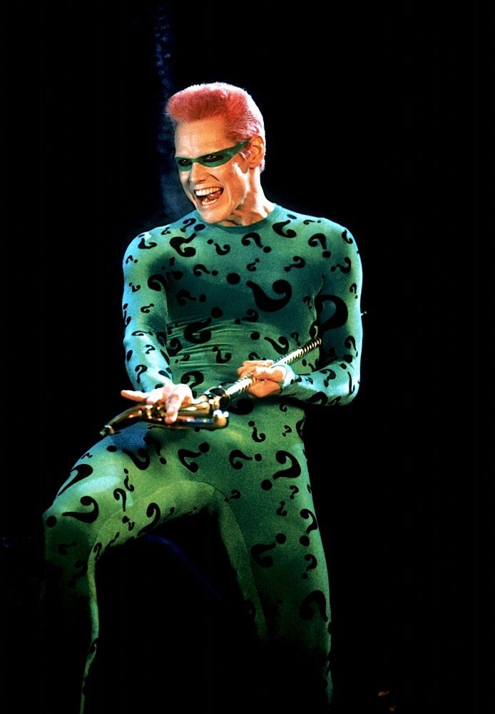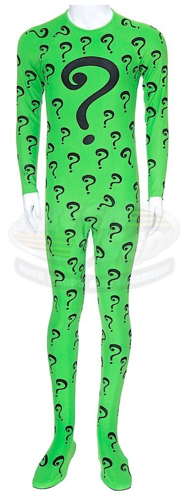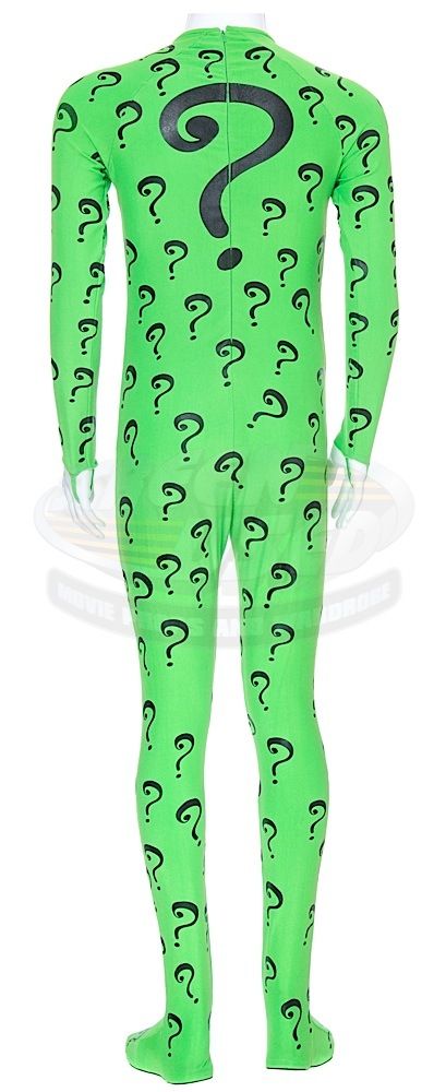 (Warner Bros., 1995) This jumpsuit was custom made by the production for use by Jim Carrey as "The Riddler". The iconic green jumpsuit with countless black question marks features built-in shoes. The jumpsuit was created during pre-production and may have been used for early costume fittings, or screen tests, as it varies slightly from the final screen used version. The jumpsuit has no size indicated and remains in very good condition.