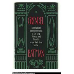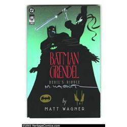 Batman/Grendel, Signed and Remarqued (First Limited Series) Group (DC, 1993) Condition: NM. One of the most epic battles of the early-90's was this showdown between Grendel and Batman, comics two dark knights. This series, written and drawn by Matt Wagner, was one of the years biggest sellers. This lot is a set of the two issues from the series, both have been signed and remarqued by Matt Wagner. Anyone attending comic book shows these days knows that the lines to meet Matt can run hours long, and at this point he only signs books. All of his art is now marketed through an agent, he does sketches before shows without distraction. This is a great opportunity to pick up a great story with sketches on the covers! On the cover of Batman/Grendel it is signed with Matt adding the symbols for Batman and Grendel in gold. On the cover of Grendel/Batman he adds a shot of the two fighting in the moonlight. Both issues are near mint. Important notice: Heritage usually auctions material at the rate of 200-250 lots per hour. On some occasions eBay Live bid software or the Internet may not be able to keep up with the pace of the auction. We recommend placing a realistic absentee bid now as insurance to avoid disappointment. Occasionally the auctioneer may eliminate or reject an eBay Live bid, and the auctioneer may also reopen a lot after the close of the eBay live bidding (usually because we missed an audience bid), and may reject your bid even if it shows you as the winning bidder. By bidding via eBay Live, you agree that Heritage may award the lot to another bidder at its sole discretion under the circumstances described above or any other reasonable circumstances. Also please note that all Heritage lots purchased through eBay Live carry a 20% Buyer's Premium. Please make sure you read the Terms and Conditions before you bid.