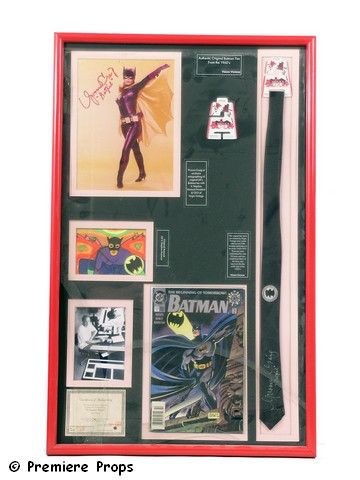 Second edition Limited Edition Julie Newmar as "Catwoman" in "Batman" (1966)#1 of 125. Includes Julie Newmar's 8x10 matted photo as "Catwoman", signed by Newmar, official vintage "Batman", necktie signed by Newmar, a photo of Newmar signing, original "Batman" artwork at artwork (signed, by artist), DC "Catwoman" comic (#210) and COA (Frame approx. 28x16). Note: The bottom third of the frame is broken.