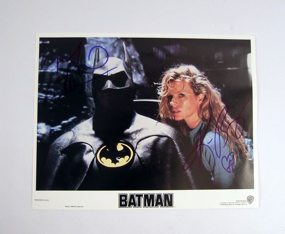 In 1989, Tim Burton brought Batman shimmering into the limelight with his own astonishing and unique version of the classic character. With Michael Keaton in the lead role and Jack Nicholson as the Joker, and Kim Basinger as the love interest, Vicki Vale, Burton brought the cape crusader soaring back to life... with such success and ferocity, that he continues on the big screen to this day! This is an over-large lobby card from "Batman", showing Batman and Vicki. It is signed by Michael Keaton and Kim Basinger (she adds her trademark heart to her signature as well). Card is 14"x11".