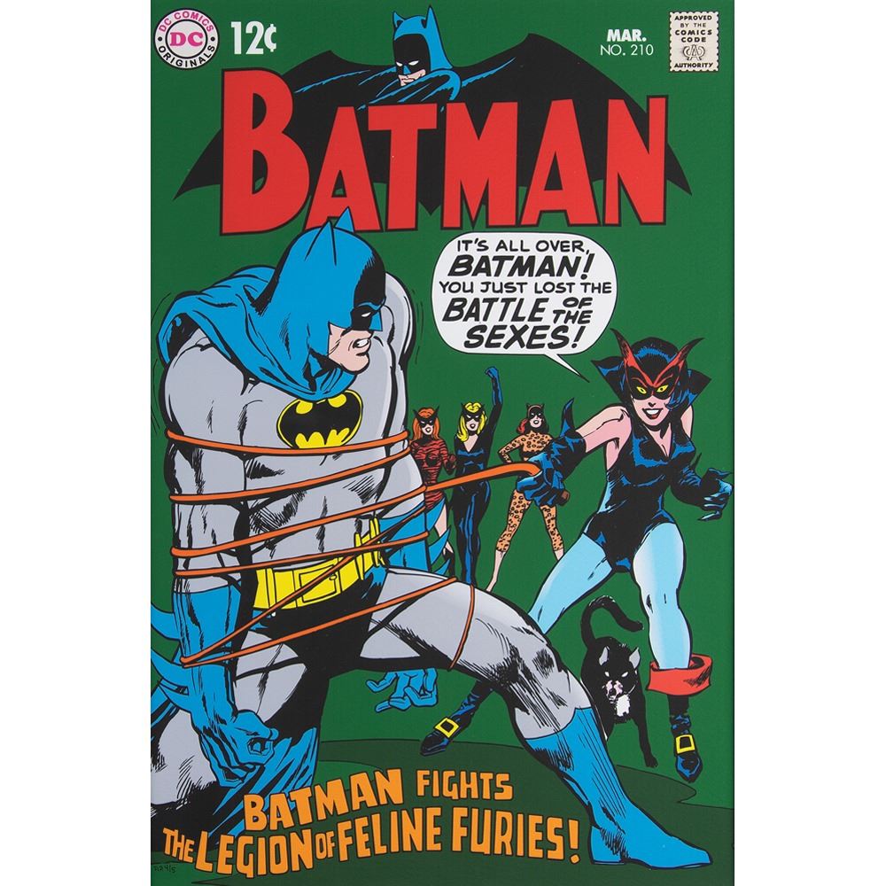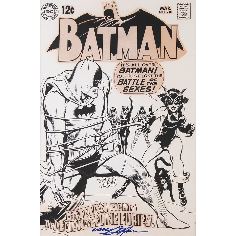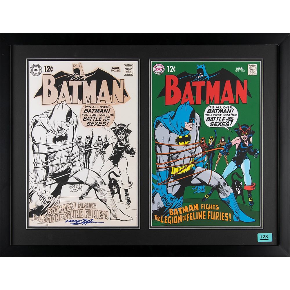 Limited edition double aperture display entitled 'Batman Fights the Legion of Feline Furies!,' numbered AP 4/5, featuring side-by-side 11 x 17 giclee prints of Neal Adams's cover artwork for Batman No. 120, signed on the 'raw' version in blue felt tip by Adams. Double-matted and framed to an overall size of 30 x 23. In very fine condition. Accompanied by a certificate of authenticity from Classic Moments and by a photo of Adams taken at the time of signing.