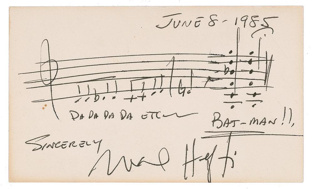 AMQS on an off-white 5 x 3 card. Hefti writes the music and “Da Das” and “Batman” to the Batman theme, signed at the bottom and dated June 8, 1985. In fine condition, with a uniform shade of mild toning.