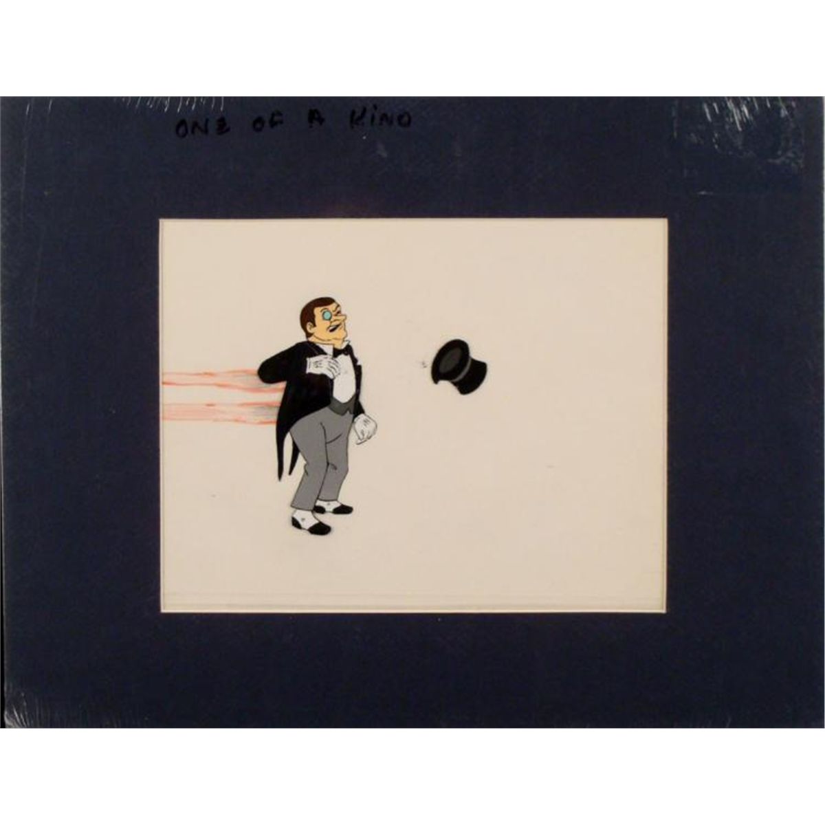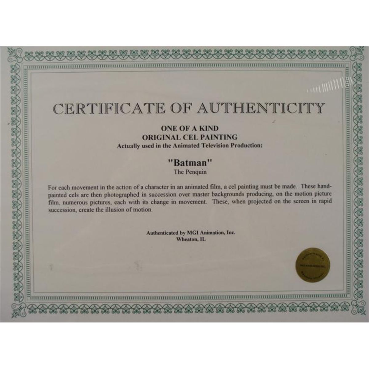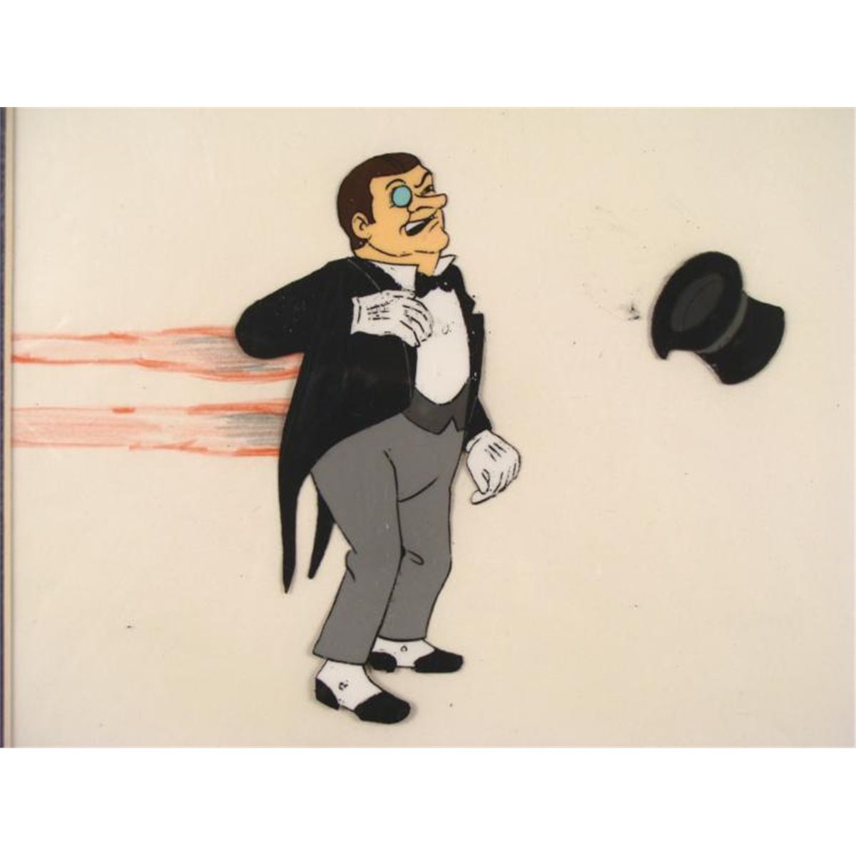 This is an original animation cel used in the production of a Batman cartoon. This cel features the Penguin with his hat apparently blowing off his head. The drawing behind appears to be flames shooting out his back, * Medium: Hand-inked and hand-painted acetate cel; colored pencil on paperImage size: 11 x 8 1/2 inchesPresentation: Matted in purpleMatte size: 18 x 14 inchesCondition: Excellent; sealed in cellophaneCertificate of Authenticity: Included